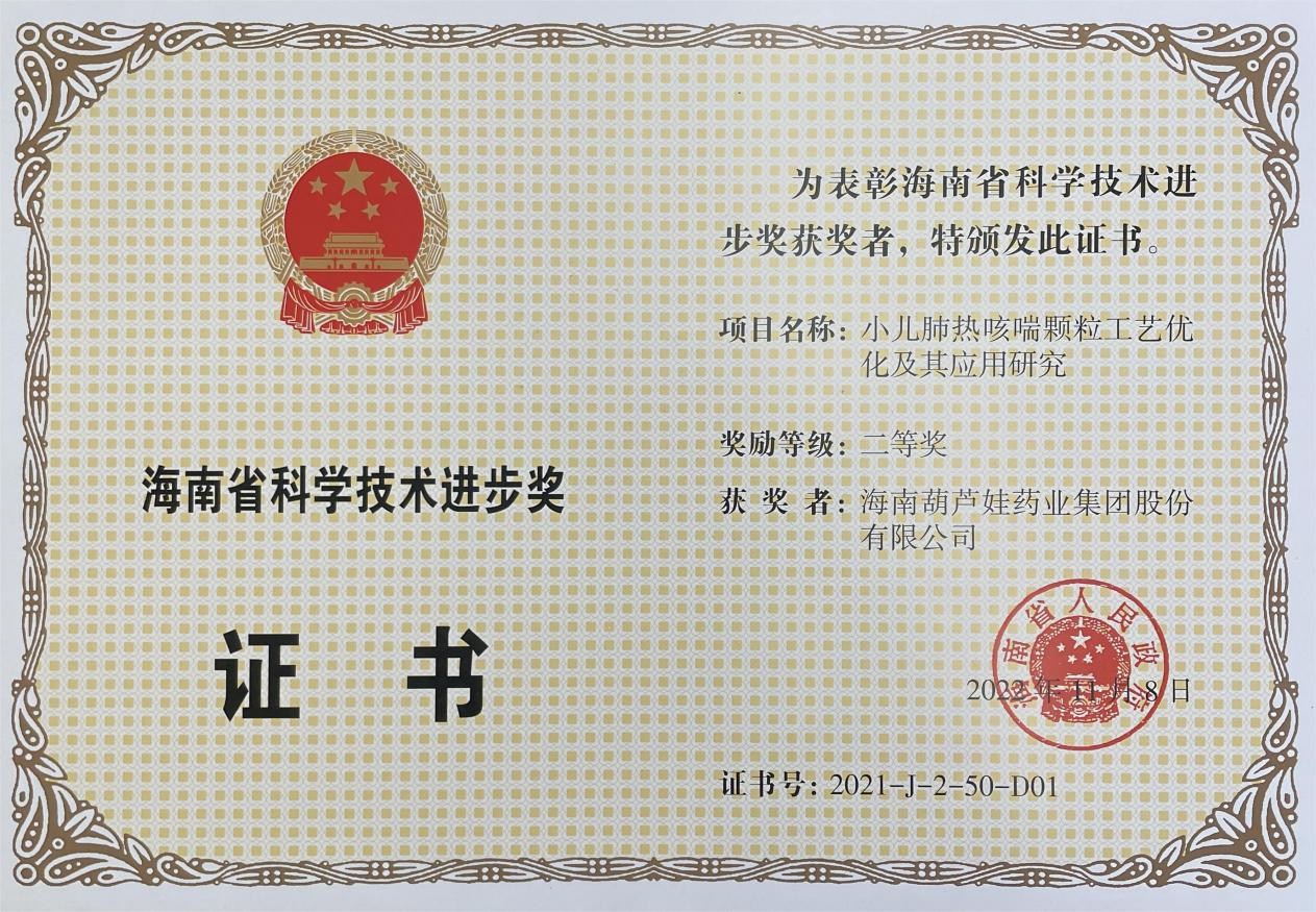 为此,小儿肺热咳喘颗粒的制备方法获得了第二十一届中国专利优秀奖(2019年),专利申请号:ZL201010134951,此次作为专利技术的应用,获得了2021年度海南省科学技术进步奖二等奖。在此之前,EBpay牌小儿肺热咳喘颗粒还多次被授予“临床价值中成药品牌”、“中国连锁药店最具合作价值单品”,荣登“中国医药品牌榜”。